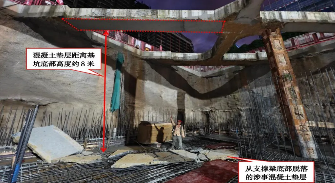 3时30分许,潘某兵(死者)在涉事支撑梁下方作业时,被突然从支撑梁底部脱落的混凝土垫层砸中导致受伤后失去意识。