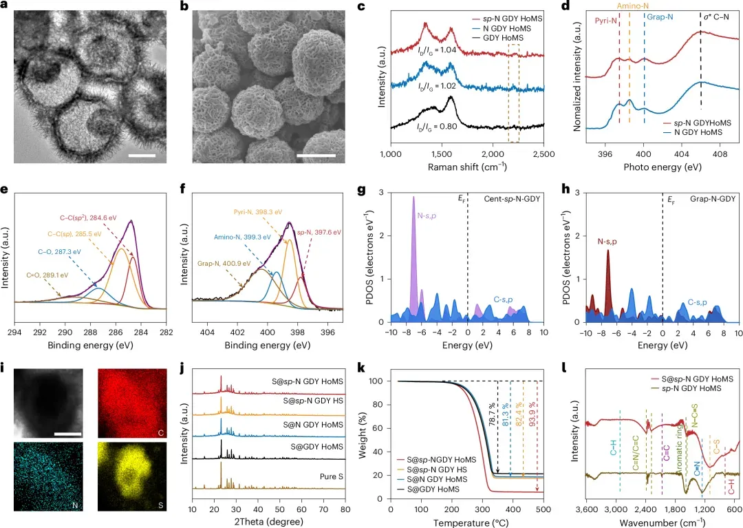 针对上述难题,研究团队构筑了由纳米薄片组装而成的 sp-N GDY HoMS。通过 sp-N 位点与其邻近碳原子之间形成的局域电子结构调控,建立对多硫化物更有利的吸附—催化协同区域;同时借助多壳层中空结构提供分级限域空间、体积缓冲以及快速传输通道。