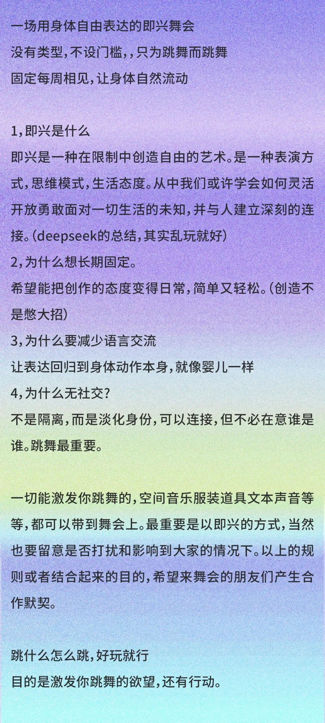 即兴的刺是一个无类型舞会,无带领不社交,少语言多跳舞的场域