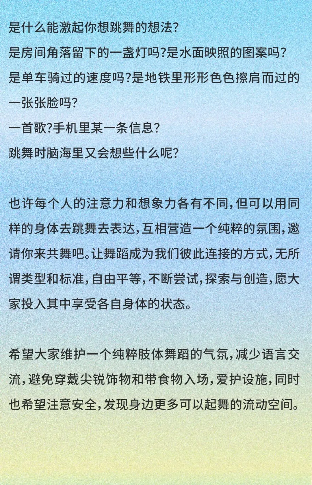 当然,也希望有各种身体练习经验的朋友不定期带来些分享,有关身体的,即兴的,表演的,运动的,也或者可以是杂技、功夫、身心学、康复等等