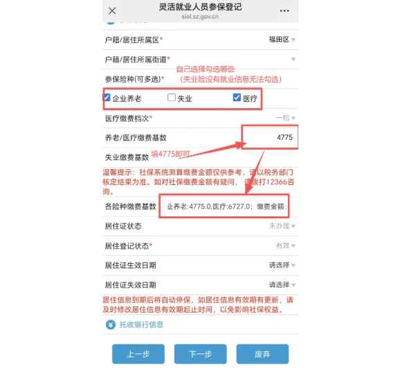 点击“灵活就业参保登记”,点击“立即办理”填写信息即可有不会勾选和填写社保基数,导致社保比其他人贵了的,在最后一步,基数只需要填写4775元即可,医保基数会自动以最低缴费基数设置!