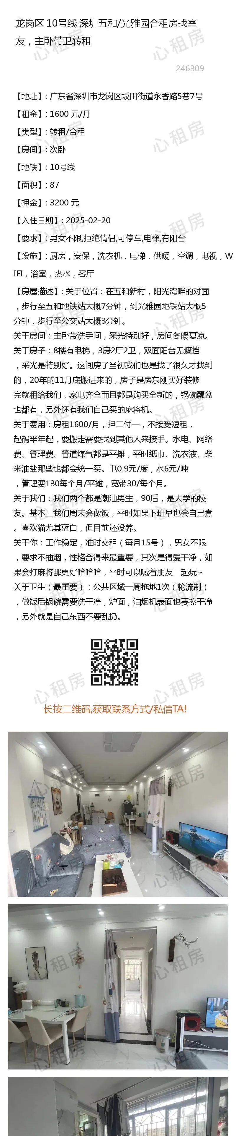 深圳租房【龙岗4则】房源①:10号线深圳龙岗五和/光雅园合租房找室友主卧带卫转租1600元/月;房源②:…