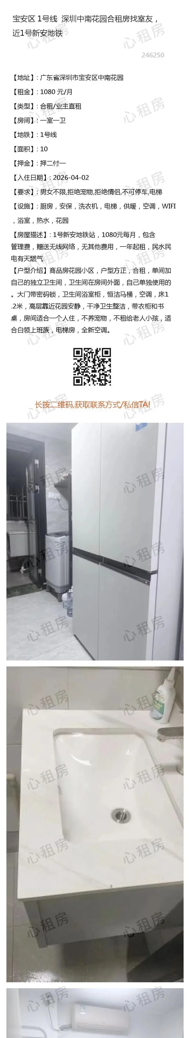 深圳租房>> 宝安区1号线 深圳中南花园合租房找室友,近1号新安地铁1080元/月