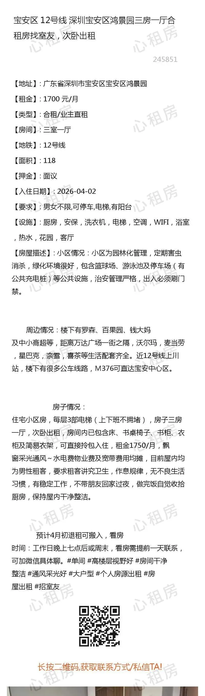 深圳租房>>宝安区12号线深圳宝安区鸿景园三房一厅合租房找室友,次卧出租1700元/月