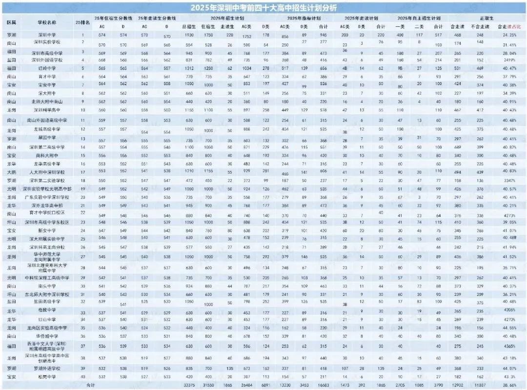 日常模考的等级表现,可直接作为孩子当前升学定位的参考,对照目标及时调整备考节奏。2025深圳前四十大高中招生及录取线数据(点击可放大查看)在前四十大高中 33375 人的总招生名额中, 非深户仅占 6891 人,占比 20.65% ,远低于深户招生占比,非深户孩子想冲进优质高中,需要在成绩上更具优势,避免因名额少错失机会。同时,前四十大高中的招生名额按三类渠道分配,家长可根据孩子的成绩特点、自身优势规划报考方向:- 正取生名额(含走读):12902 个,占总招生数的 38.66%