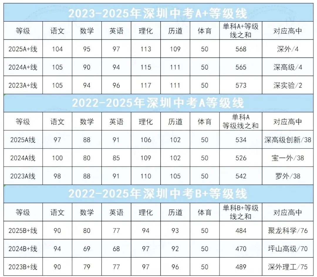 很多家长会非常想知道:孩子各科到底要考到什么水平,才能迈进前四十大高中的校门?参考深圳近三年中考等级线,答案十分明确: 只要孩子各科成绩均达到市单科 A 等级,即可达到前四十大高中的录取成绩标准 。当然,实际备考中不少孩子会存在偏科问题,无需强求每科都完美达标,但需自行拆分各科分数,针对性补强薄弱科目,尽量让各科成绩向市单科 A 靠拢,避免某一科拖后腿,拉低整体等级,错失优质高中名额。