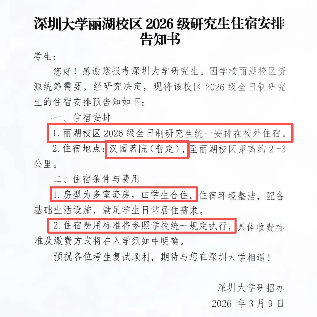今年3月初,深圳大学丽湖校区通知2026级的研究生新生,住宿安排暂定在位于深圳西丽板块的汉园茗院,距离校区约2-3公里,户型为多室合住,住宿费参照学校统一规定执行。