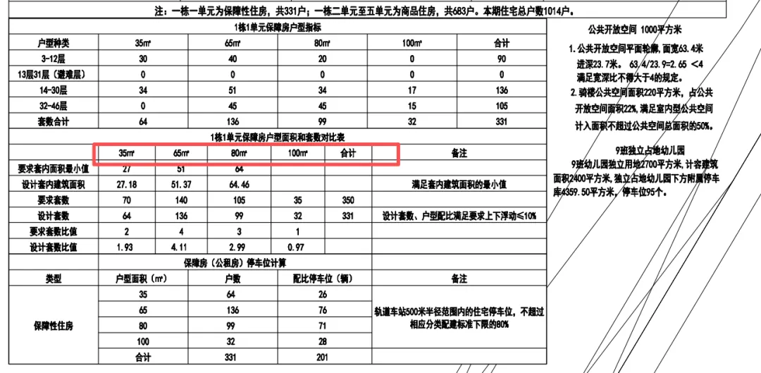 另一方面,在汉园茗院建设初期,规划要素中就包含了保障性住房配置,一栋一单元规划为保障性住房共计331户,户型面积段分别为35平米、65平米、80平米以及100平米。