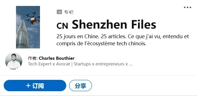他曾在美国华盛顿、荷兰海牙、德国慕尼黑以及法国巴黎等地执业或交流,服务过近百家科技初创企业,并参与法国公共投资银行Bpifrance的研发项目评估。此次中国行中,Charles Bouthier走访了大量创始人、投资者、工程师与研究人员,撰写了包含25篇文章的《深圳档案》系列笔记。