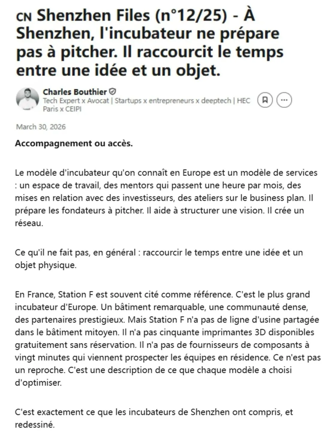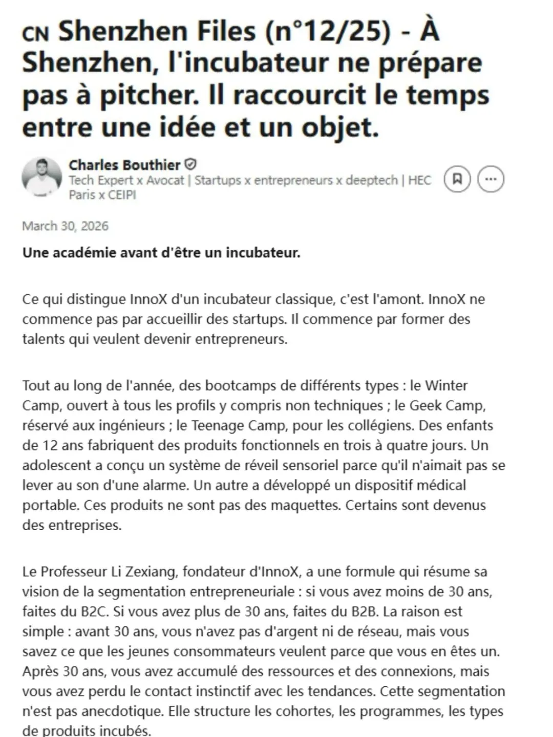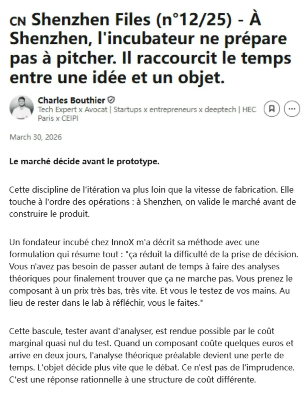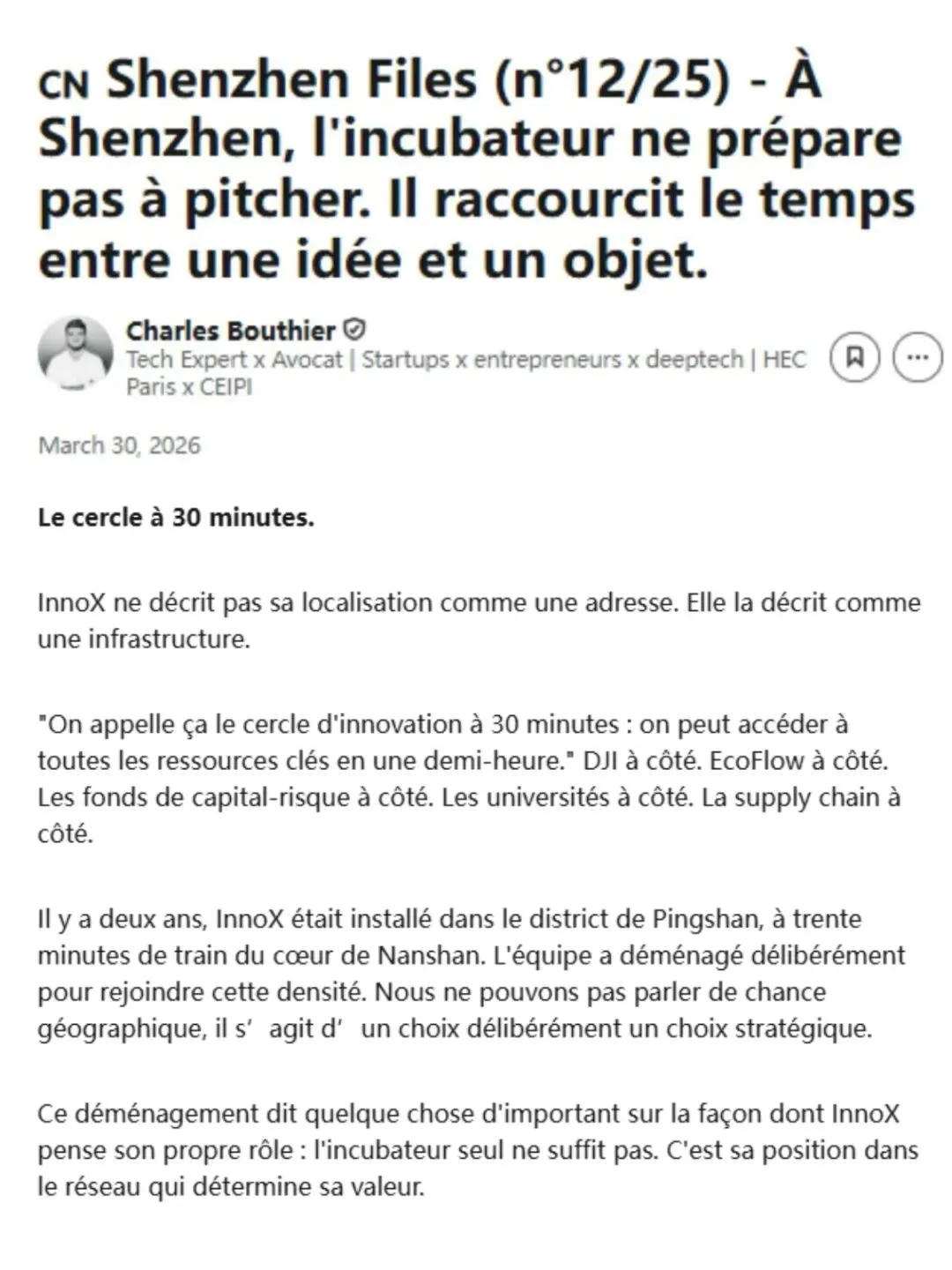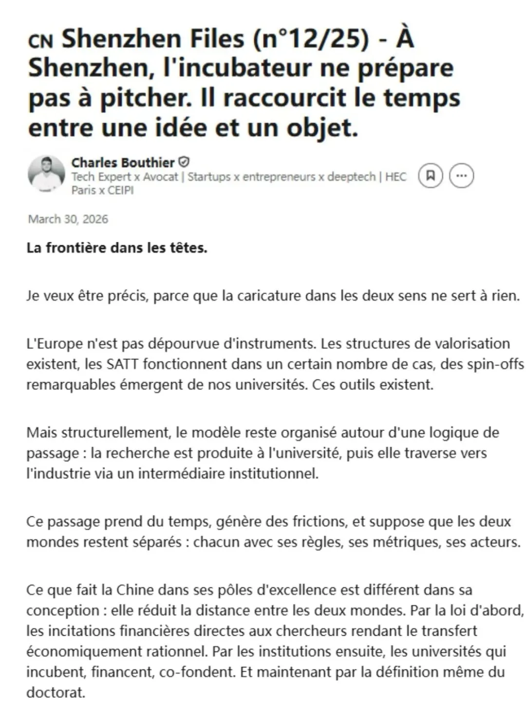 透过一位法国观察者的视角重新审视深圳,我们看到的或许不只是这座城市已经取得的成绩,更是一个仍在持续生长中的命题:当科创成为城市乃至国家的核心竞争力,真正决定其上限的不只是个别企业的成功,也不只是某一次技术突破,而是整个生态能否持续生成创新、承接创新、放大创新。