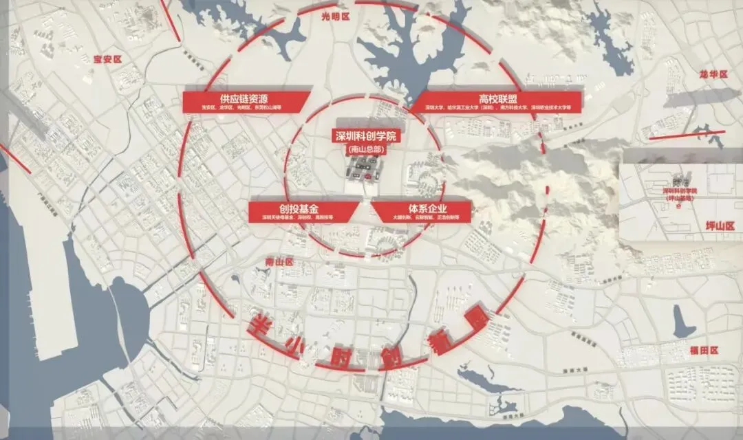 深圳科创学院位于深圳市南山区,我在这里看到了一张地图,地图中心是科创学院,以其为圆心,在半小时车程内可以触达几乎所有关键资源:大疆、正浩、云鲸等龙头企业,活跃的风险投资基金,多所高校以及整个硬件供应链。科创学院团队称之为“半小时创新圈”,这并非营销噱头,而是一个高度的区域优势,当供应商、投资者、人才和创业团队都能通过驾车、地铁甚至骑行快速接触彼此时,迭代时间就缩短到了半天。