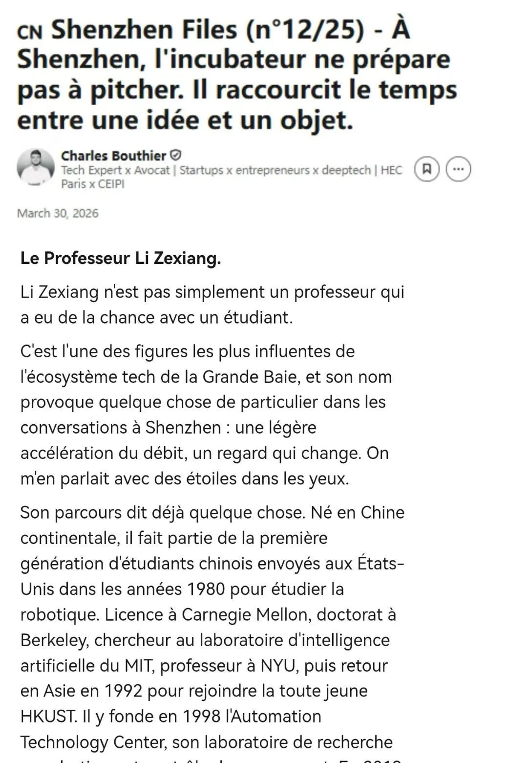 “在法国,一个离开实验室去创办公司的研究人员,有时仍然会被人(隐晦地)视为‘偏离原有轨道’;但在深圳,李泽湘教授正放大自己的影响力。”
