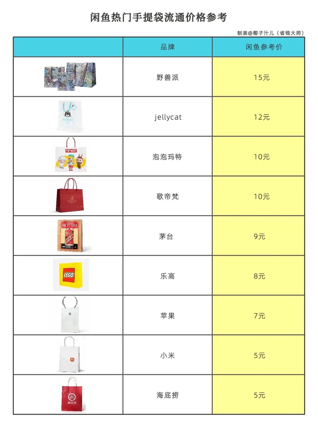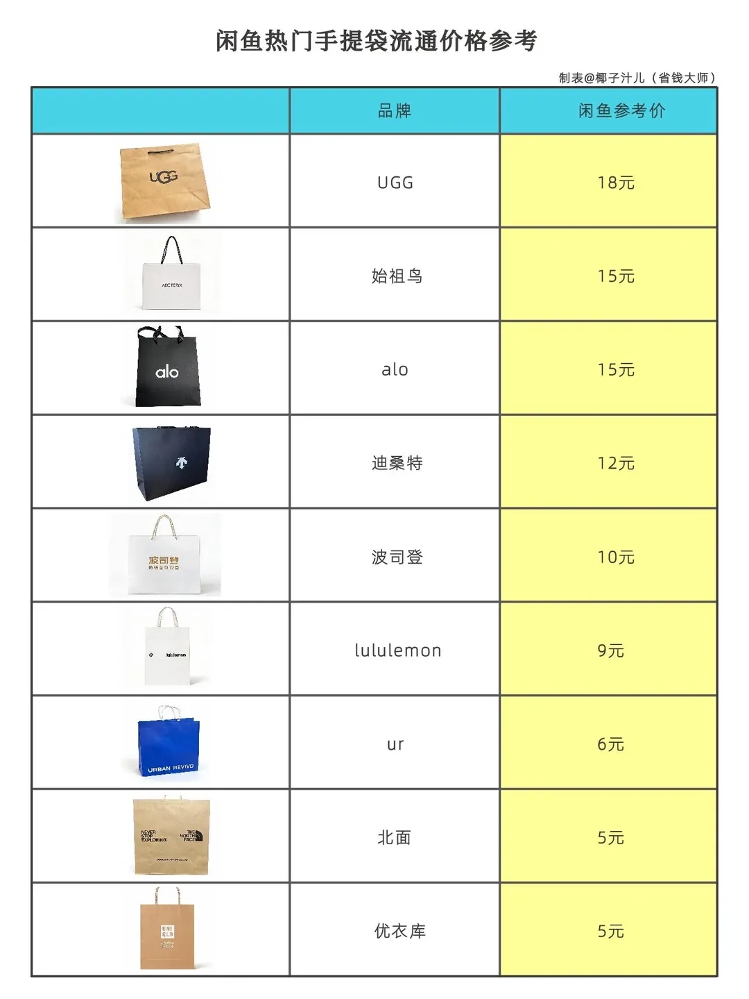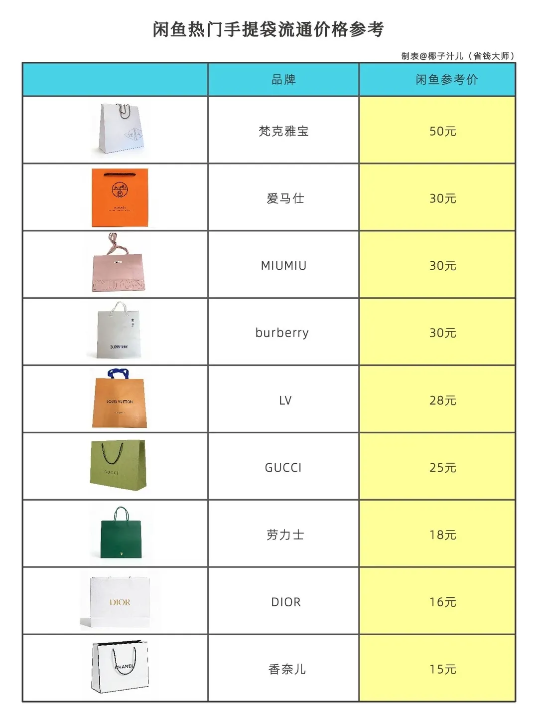 甚至有人整理出了二手平台热门手提袋流通价格表:价格从五毛到三四十元不等,其中便包含了各个品牌的奶茶袋。