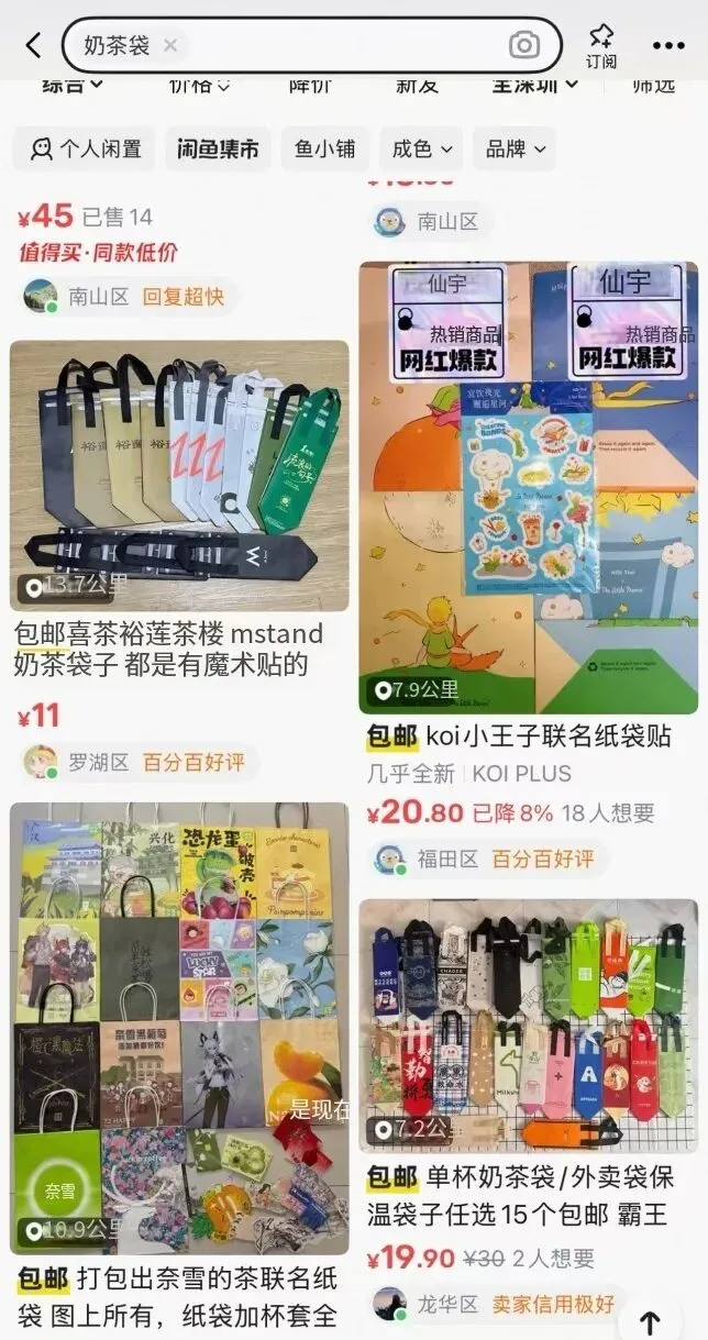 在二手平台上搜索“奶茶袋”,就会看到另一个世界。