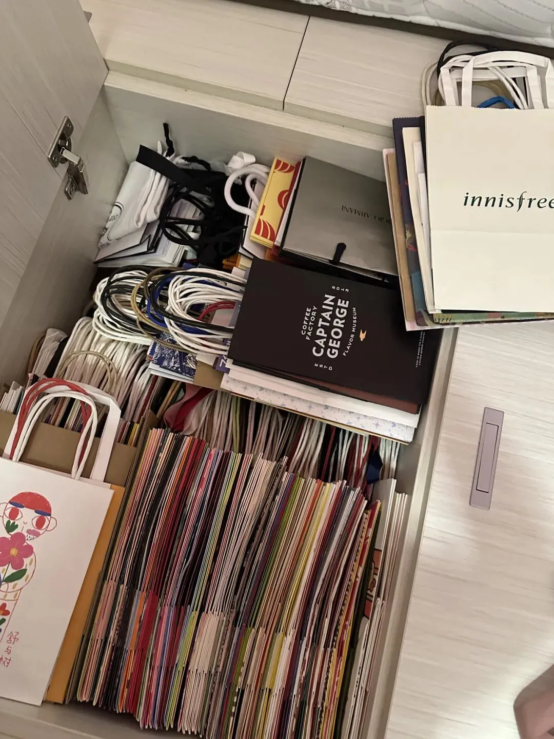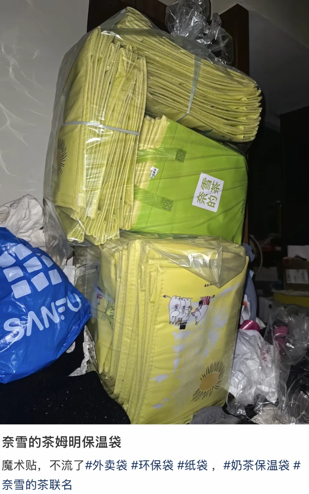 作为一个奶茶袋的资深收集玩家,汤圆家里杂物房堆了满满十几箱,收藏上千个纸袋。有奈雪、喜茶、瑞幸打底,霸王茶姬、茉莉奶白、茶理宜世、库迪、乐乐茶等等。