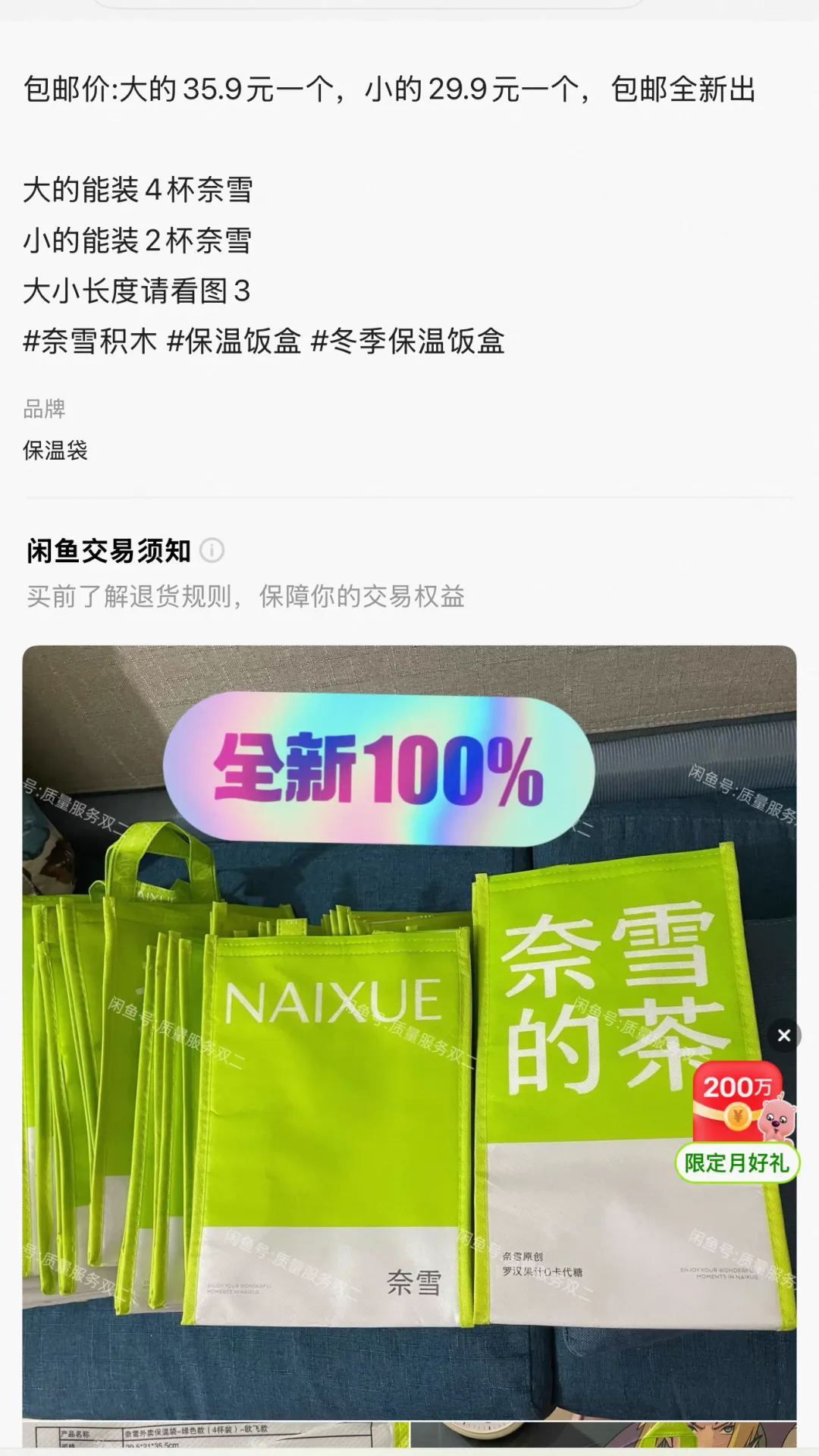 他们不贪多,死磕单品,甚至靠囤积绝版货源赚钱。最典型的就是奈雪那款绿色保温袋。