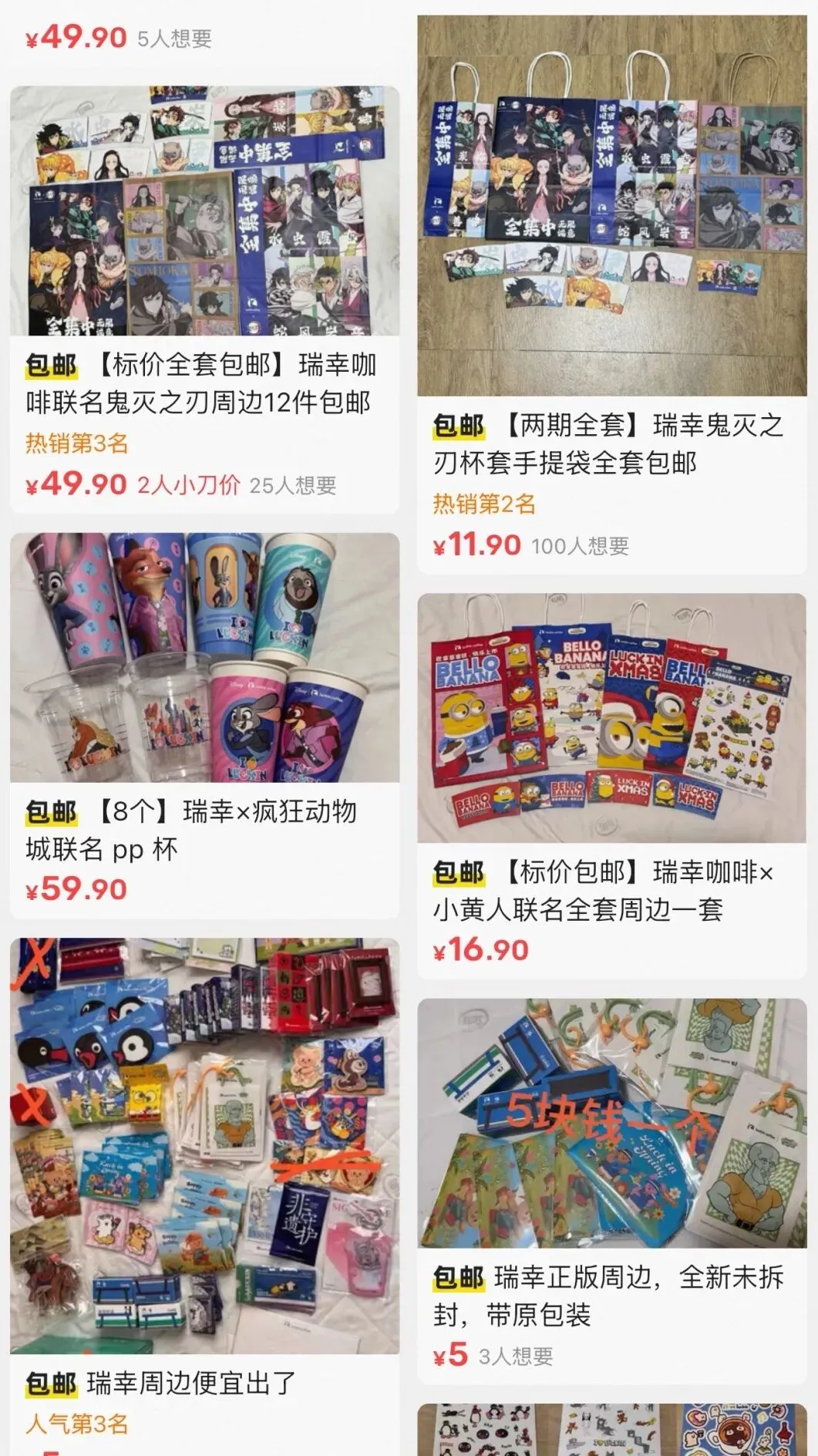 例如之前霸王茶姬的哪吒联名、瑞幸的疯狂动物城和鬼灭之刃联名等等,挂上去之后,问价的人比普通款多得多。