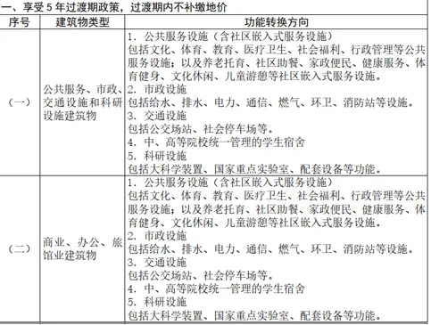 实施措施:市规划和自然资源局派出机构统一受理本辖区的建筑物功能转换项目申请区政府组织本辖区规划和自然资源、产业、生态环境、住房建设、城市更新、土地整备、交通、教育、民政、文体、卫健等有关部门以及相关执法机构和不动产登记机构进行联合审查和审定。涉及重大利益关系的,应当在联合审查前,依据相关规定开展公示;市规划和自然资源局派出机构根据审定结论向申请人出具审查意见,并抄送相关执法机构和嘱托不动产登记机构。建筑功能转换项目需同步签订补充协议或增补协议,其中《正面清单》内享受过渡期政策的项目,在 5 年有效期内无需签订协议;建筑功能转换项目有效期为 5 年,自完成竣工联合验收或完工注销之日起算;有效期届满后确需续期的,应当在符合结构安全、消防安全、抗震设防等要求的前提下,于有效期届满前 3 个月向市规划和自然资源局派出机构申请续期,经区政府批准后实施,续期时间不超过 10 年;确需长期使用的,应当在符合城市规划、产业发展方向和履约监管要求的前提下,在有效期或续期届满前 6 个月,按照转换后的功能向市规划和自然资源局派出机构申请完善土地用途变更手续。建筑功能转换项目需按深圳市地价测算规则补缴地价,其中《正面清单》内享受过渡期政策的项目 5 年有效期内不补缴地价;审查意见不作为改变土地用途或永久改变建筑物功能的依据。建筑物功能转换期间,依据申请人承诺不予办理建筑物产权转移、预告转移登记;确需拆除原建筑物的,仍按原建筑物功能和原土地使用条件处理