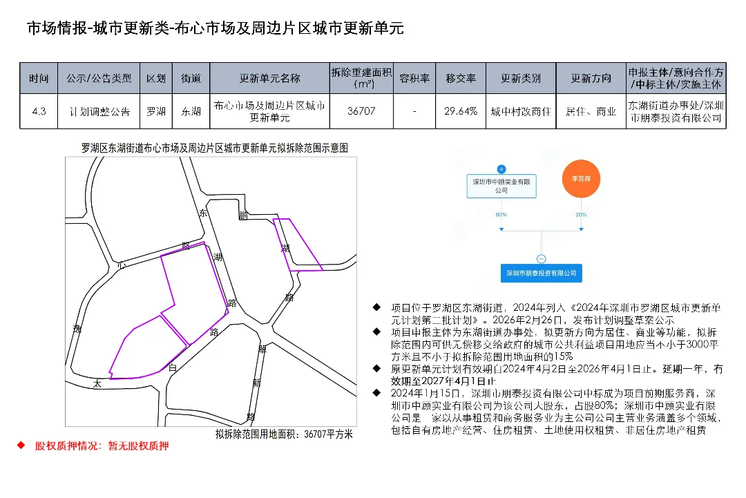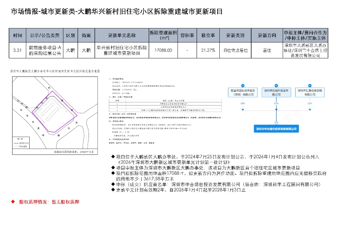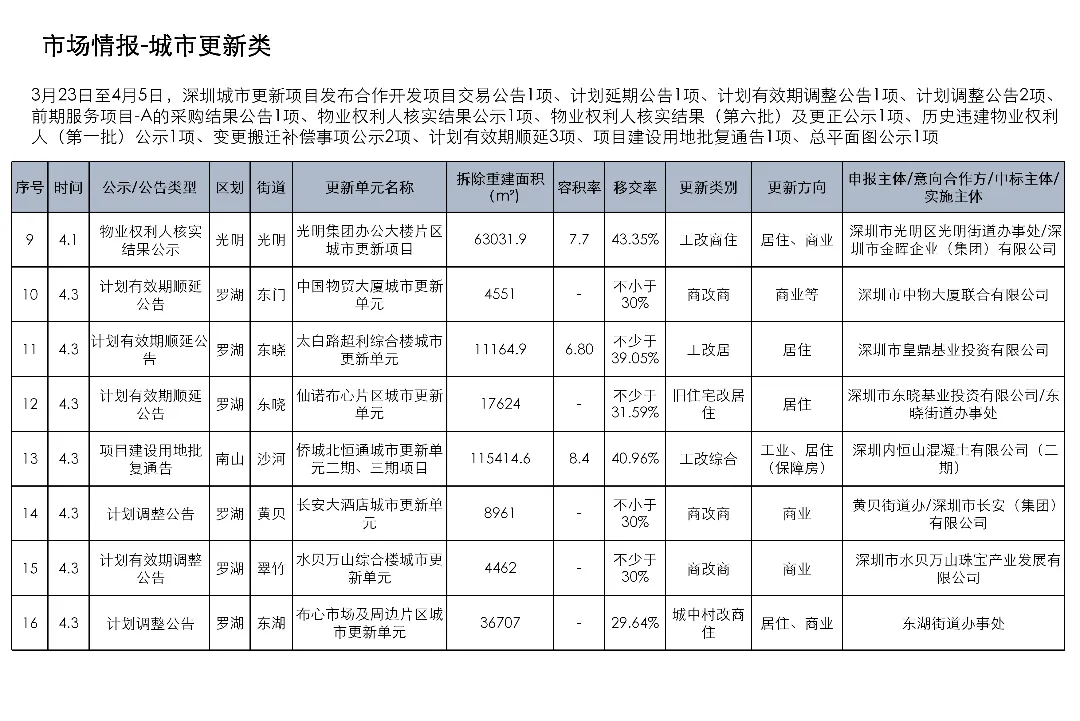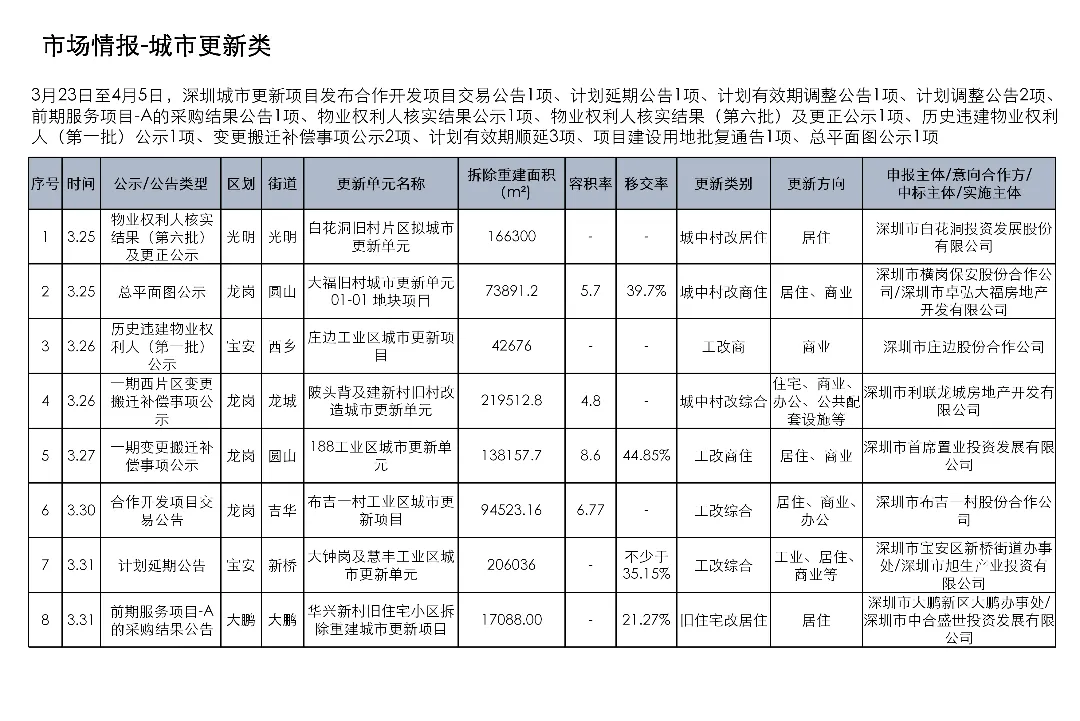 3月23日至4月5日,深圳城市更新项目发布合作开发项目交易公告1项、计划延期公告1项、计划有效期调整公告1项、计划调整公告2项、前期服务项目-A的采购结果公告1项、物业权利人核实结果公示1项、物业权利人核实结果(第六批)及更正公示1项、历史违建物业权利人(第一批)公示1项、变更搬迁补偿事项公示2项、计划有效期顺延3项、项目建设用地批复通告1项、总平面图公示1项