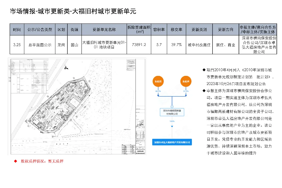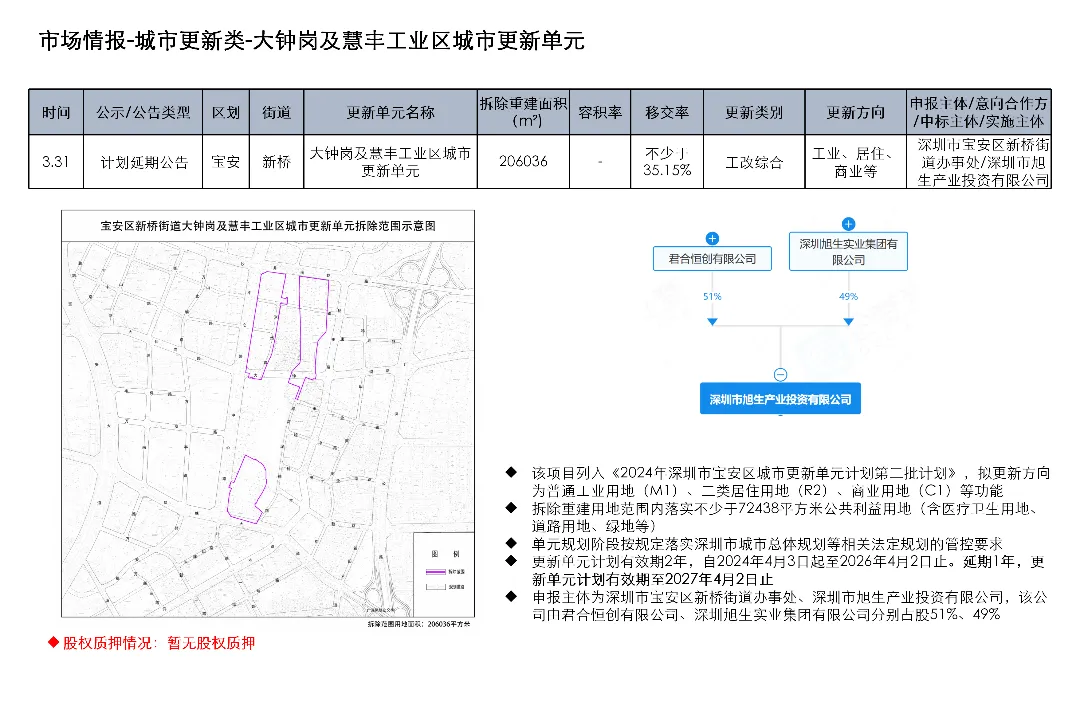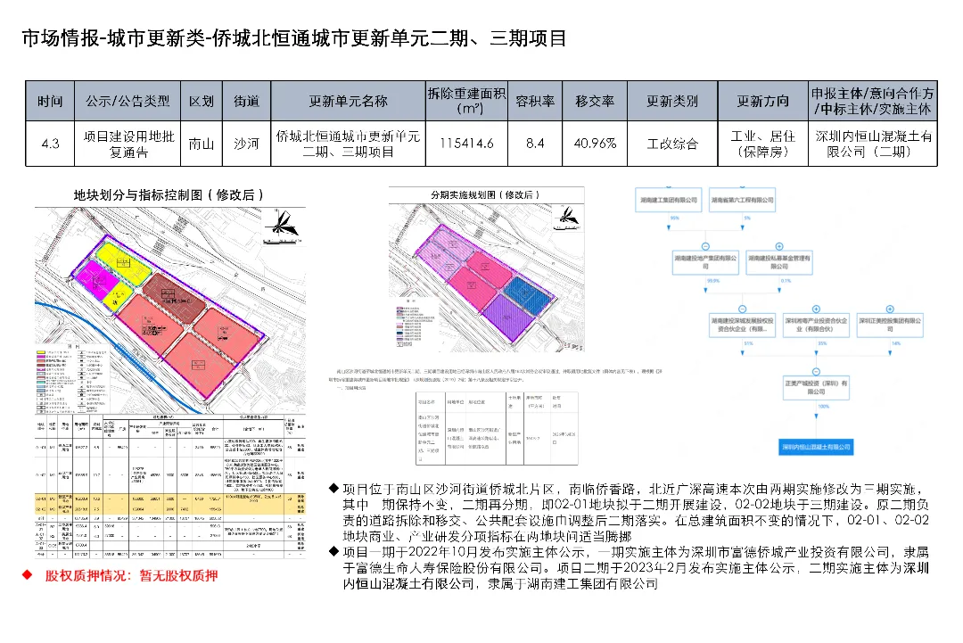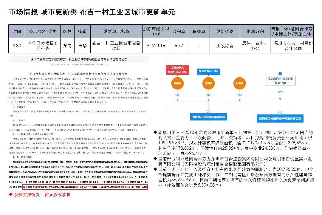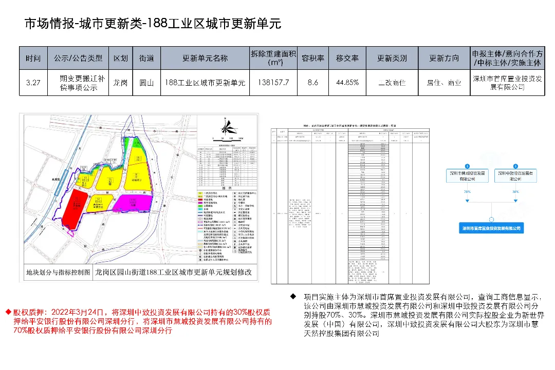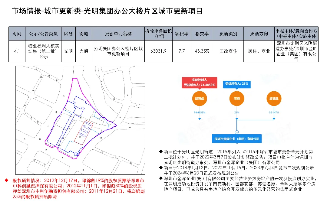 光明区光明街道光侨路与光明大街交叉口东侧的土地使用权及在建工程关联城市更新项目为大捷达工业区城市更新单元01-01地块;这宗土地的证载用途是新型产业用地;项目于2016年12月1日发布规划公示,于2019年4月2日、2020年2月21日、2020年3月13日发布两次规划修改公示和一次规划修改公告。项目拟拆除用地面积40458.8㎡,开发建设用地36495.2㎡,计容积率总建筑面积203970㎡,规划容积率5.6