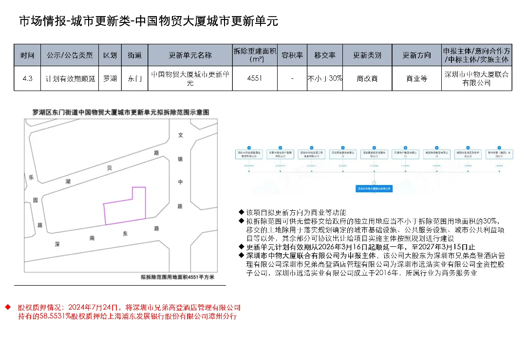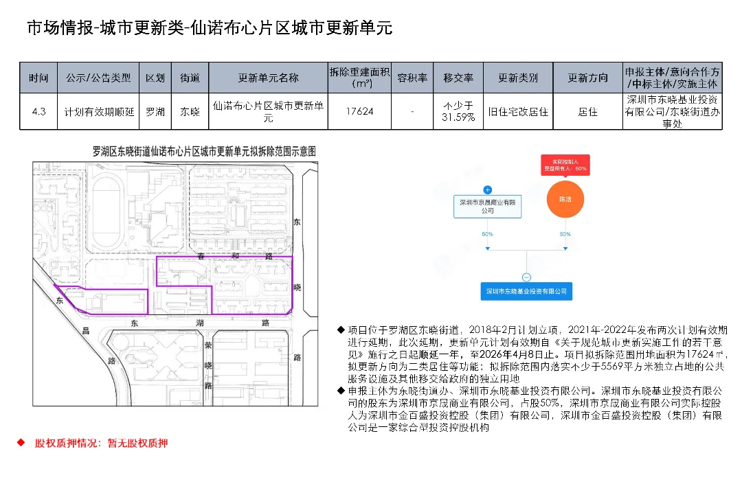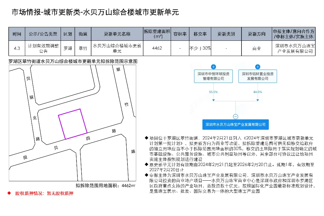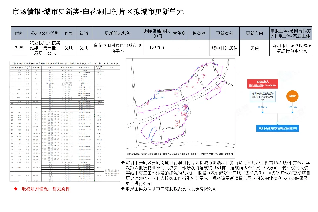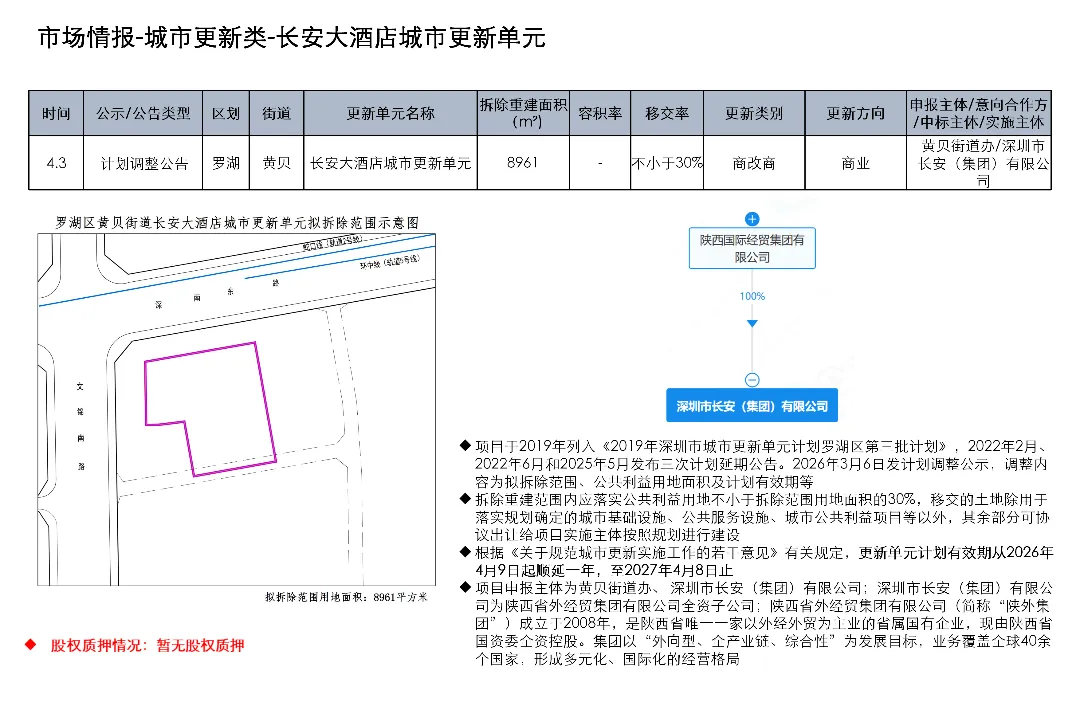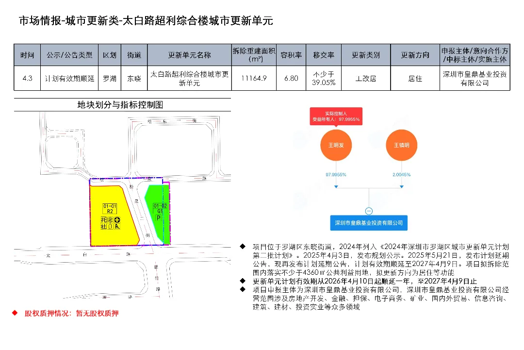 光明区光明街道光侨路与光明大街交叉口东侧的土地使用权及在建工程关联城市更新项目为大捷达工业区城市更新单元01-01地块;这宗土地的证载用途是新型产业用地;项目于2016年12月1日发布规划公示,于2019年4月2日、2020年2月21日、2020年3月13日发布两次规划修改公示和一次规划修改公告。项目拟拆除用地面积40458.8㎡,开发建设用地36495.2㎡,计容积率总建筑面积203970㎡,规划容积率5.6