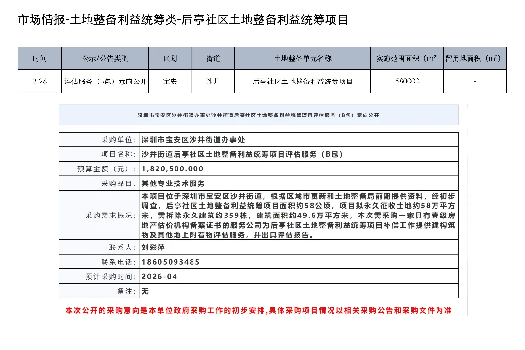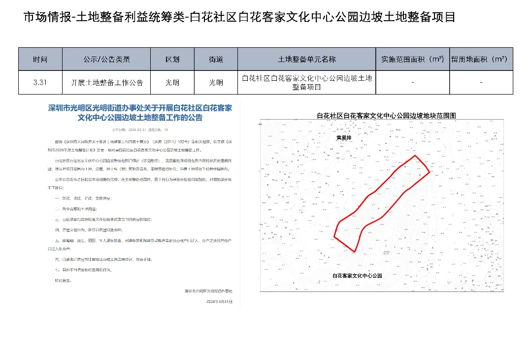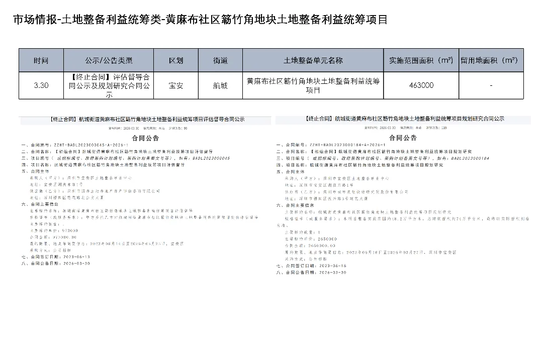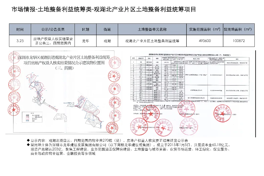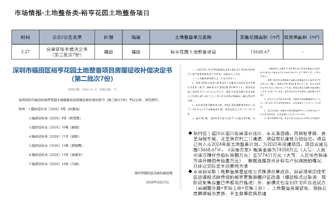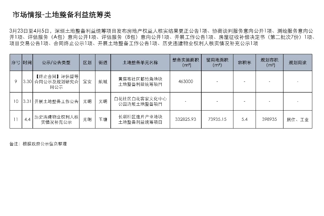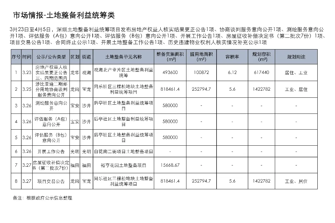 3月23日至4月5日,深圳土地整备利益统筹项目发布房地产权益人核实结果更正公告1项、协商谈判服务意向公开1项、测绘服务意向公开1项、评估服务(A包)意向公开1项、评估服务(B包)意向公开1项、开展工作公告1项、房屋征收补偿决定书(第二批次7份)1项、项目交易公告1项、合同终止公示1项、开展土地整备工作公告1项、历史违建物业权利人核实情况补充公示1项