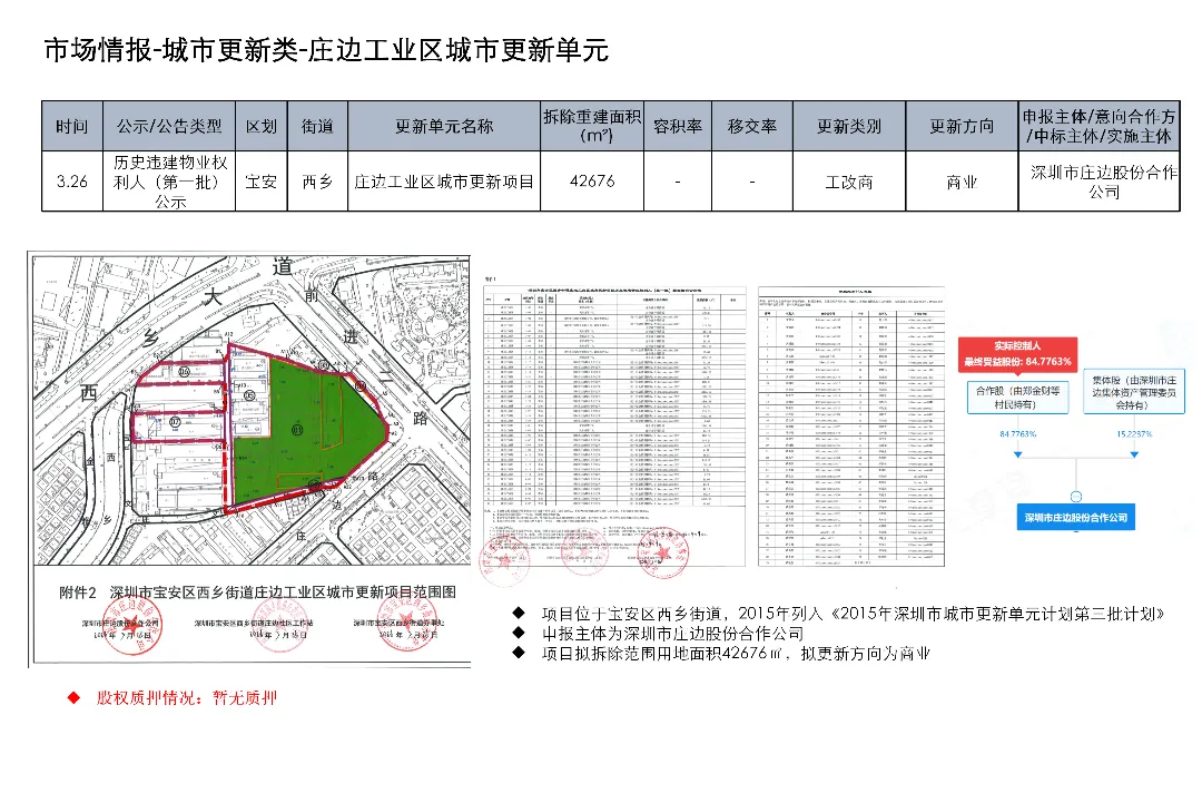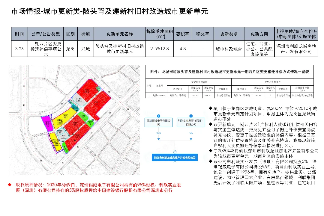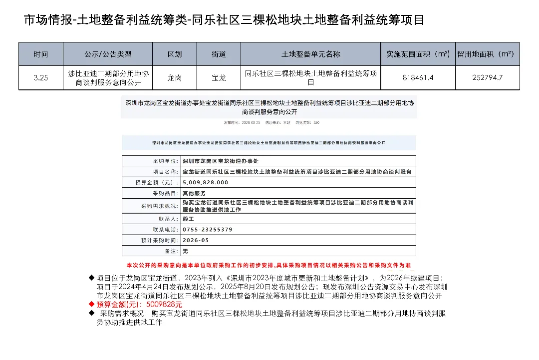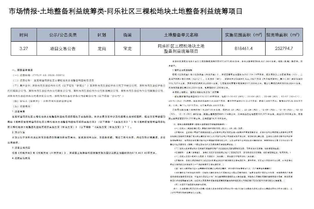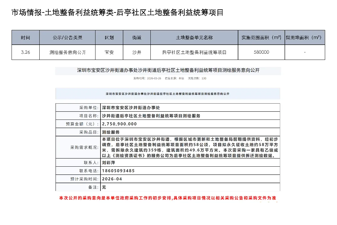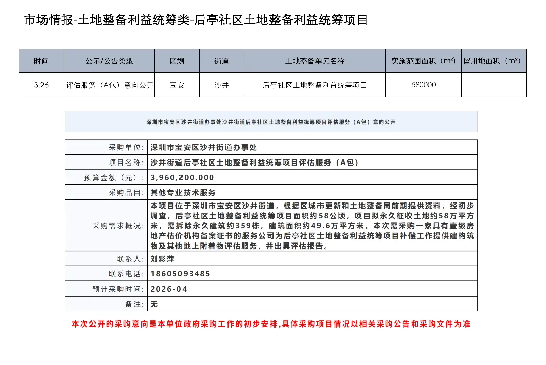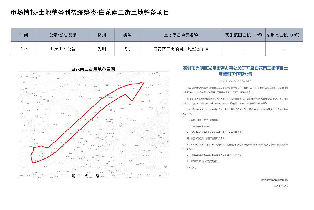 3月23日至4月5日,深圳土地整备利益统筹项目发布房地产权益人核实结果更正公告1项、协商谈判服务意向公开1项、测绘服务意向公开1项、评估服务(A包)意向公开1项、评估服务(B包)意向公开1项、开展工作公告1项、房屋征收补偿决定书(第二批次7份)1项、项目交易公告1项、合同终止公示1项、开展土地整备工作公告1项、历史违建物业权利人核实情况补充公示1项