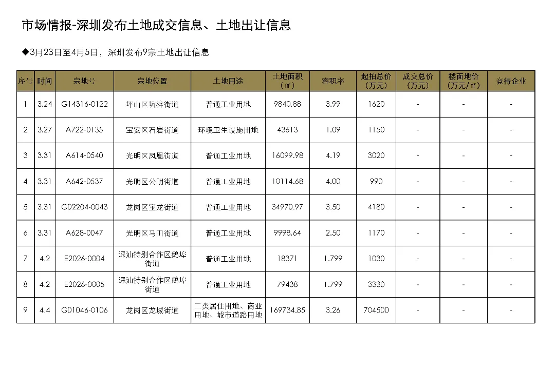 3月23日至4月5日,深圳发布9宗土地出让信息