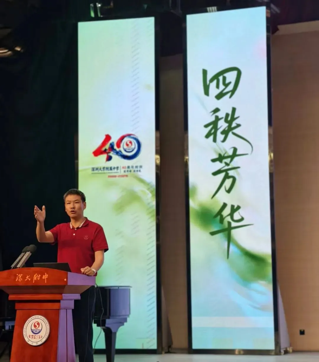 他首先向大家介绍了深圳大学附属教育集团的发展历程与办学理念,深情回顾了学校四十年来从无到有、从小到大的奋斗之路。不少同学悄悄握紧了拳头——那是被点燃的梦想在心底发芽的声音。