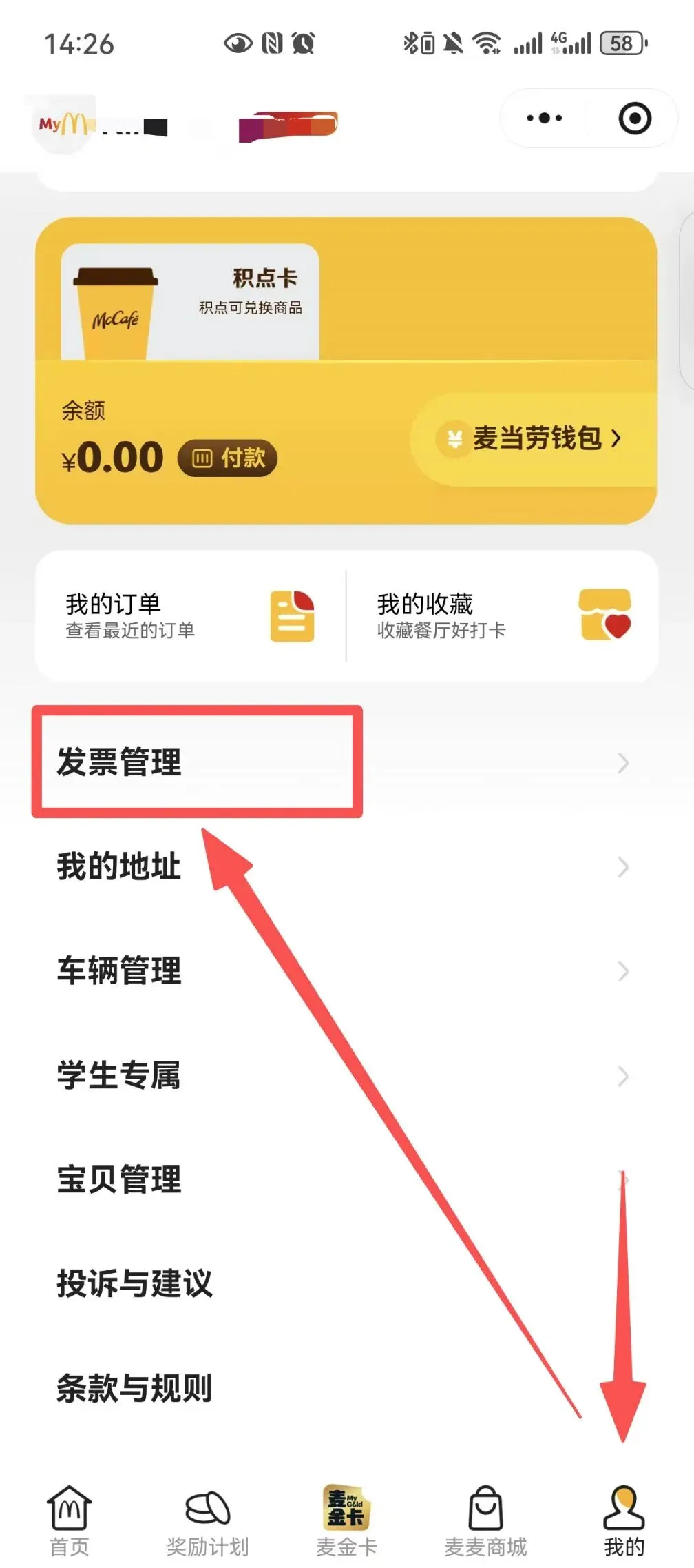 第一步:进入,麦当劳微信小程序,点击右下角我的,然后点击发票管理;