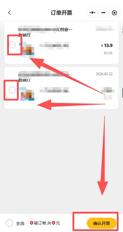 第二步:点击订单开票,然后可以勾选同一门店的多个订单,大家凑够100元就可以点击确认开票了!
