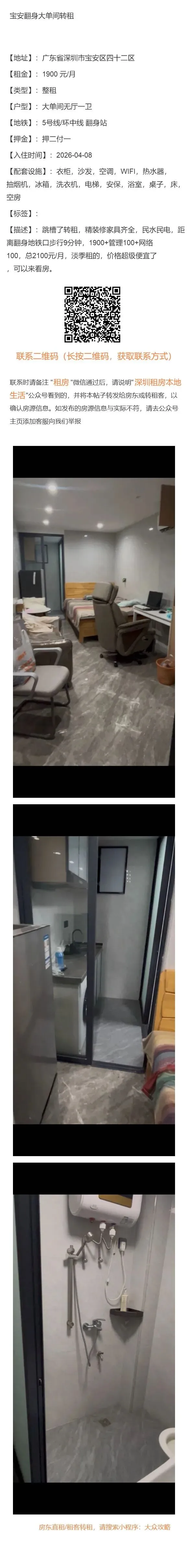 【深圳租房本地生活:免责申明】以上内容受用户委托发布,谢绝转载。房源信息的真实性、合法性由提供者负责,本公众号不声明或保证内容之正确性和可靠性,深圳租房需谨慎,请先核实出租人身份,仔细阅读租房合同,切勿轻易转账、交订金等,房屋出租过程中产生的一切问题,与本公众号无关。【深圳租房本地生活:特别申明】深圳租房本地生活没有任何线下业务人员,请勿轻信冒认我司线下工作人员及电话沟通人员,我司目前唯一对外沟通窗口为公众号主页客服微信:Hey_Beijinger