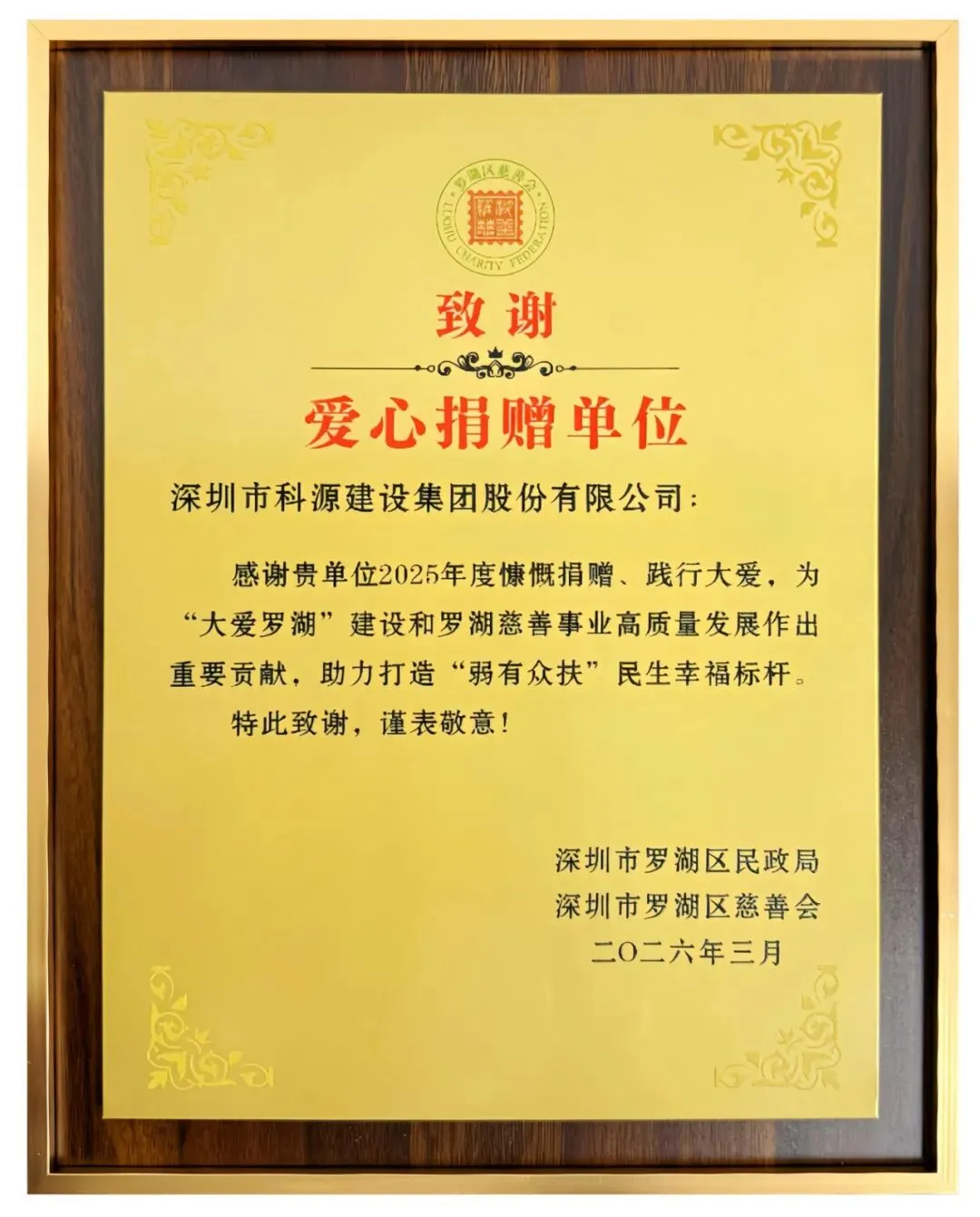 【科源股份】凝心聚力,再启新程 | 获深圳市罗湖区民政局授予“爱心捐赠单位”