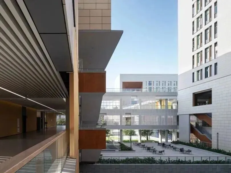校园核心亮点为独具特色的“都市合院主义”系列建筑,其设计中的“合院之美”的理念贯穿校园标志性建筑与景观,实现了“山、林、院”空间和谐共生,承载了“十年树木,百年树人”的教育理念。