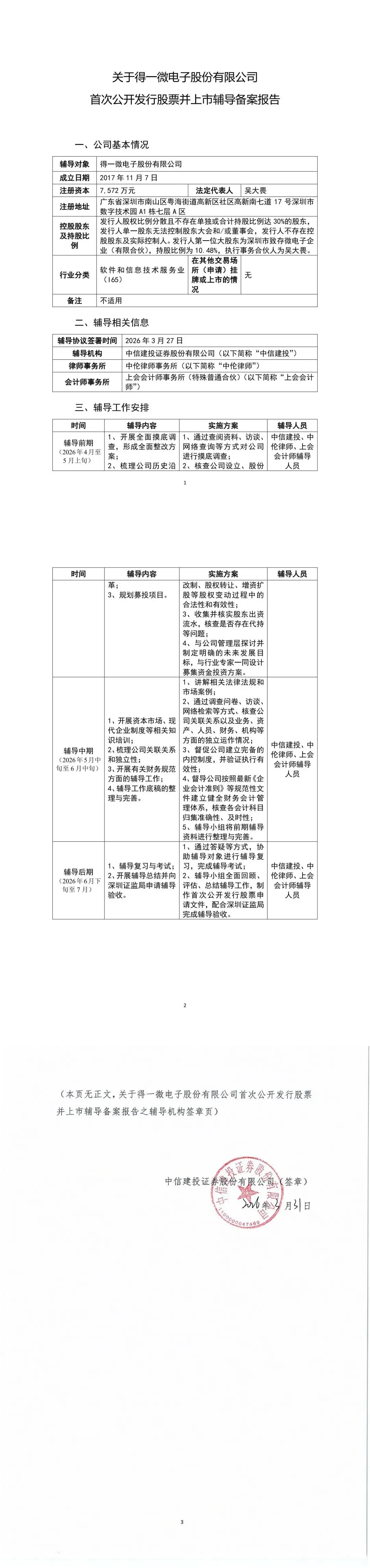已提交《关于得一微电子股份有限公司首次公开发行股票并上市辅导备案报告》。辅导机构为中信建投证券股份有限公司,律师事务所为中伦律师事务所,会计师事务所为上会会计师事务所(特殊普通合伙)。