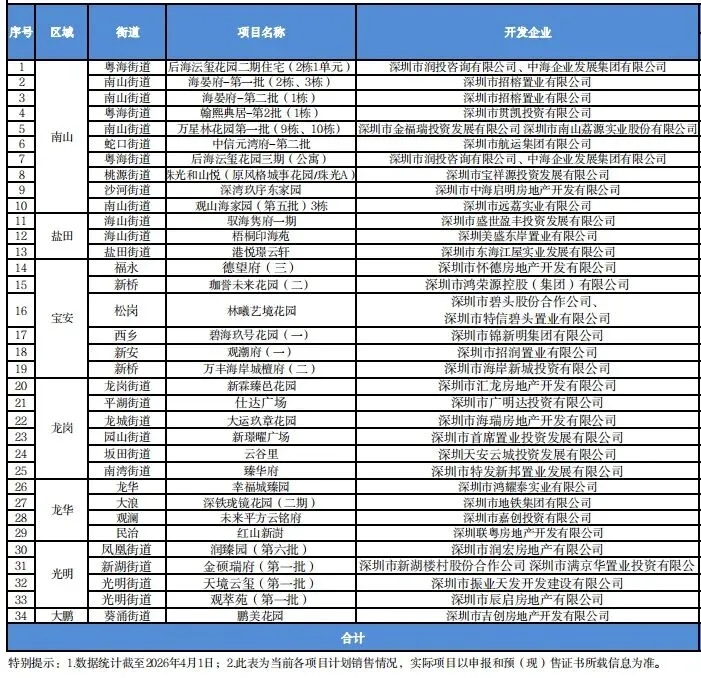 根据深圳市住建局公布的最新计划, 2026年第二季度,深圳市计划入市的商品房项目34个,预计供应房源面积为1226812平方米,10909套,其中:住宅1054451.24平方米,9064套;商务公寓75080.5平方米,838套;商业47615.1平方米,602套;办公49665.5平方米,405套(详见下图)。