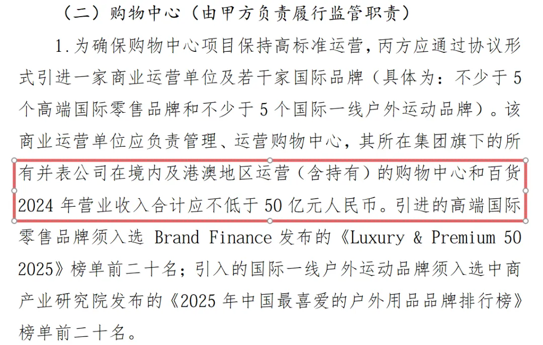 而围绕潜在买家的热议,还源于出让文件为商业运营方设置的两项前所未有的高门槛条款:例如要求运营方在2024年度境内及港澳地区运营的购物中心及百货营收合计不低于50亿元;此外,必须引进不少于5个入选《2025全球高档和奢侈品牌价值50强》前20名的高端国际零售品牌。