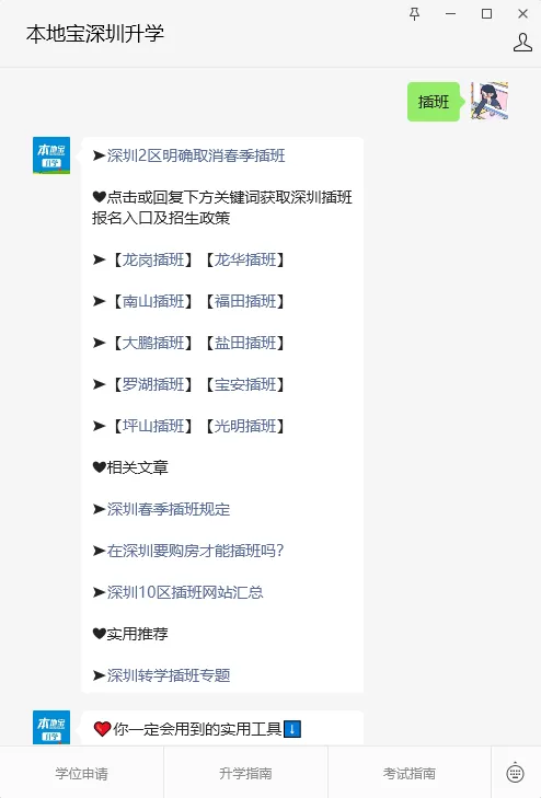 进入【本地宝深圳升学】回复【插班】