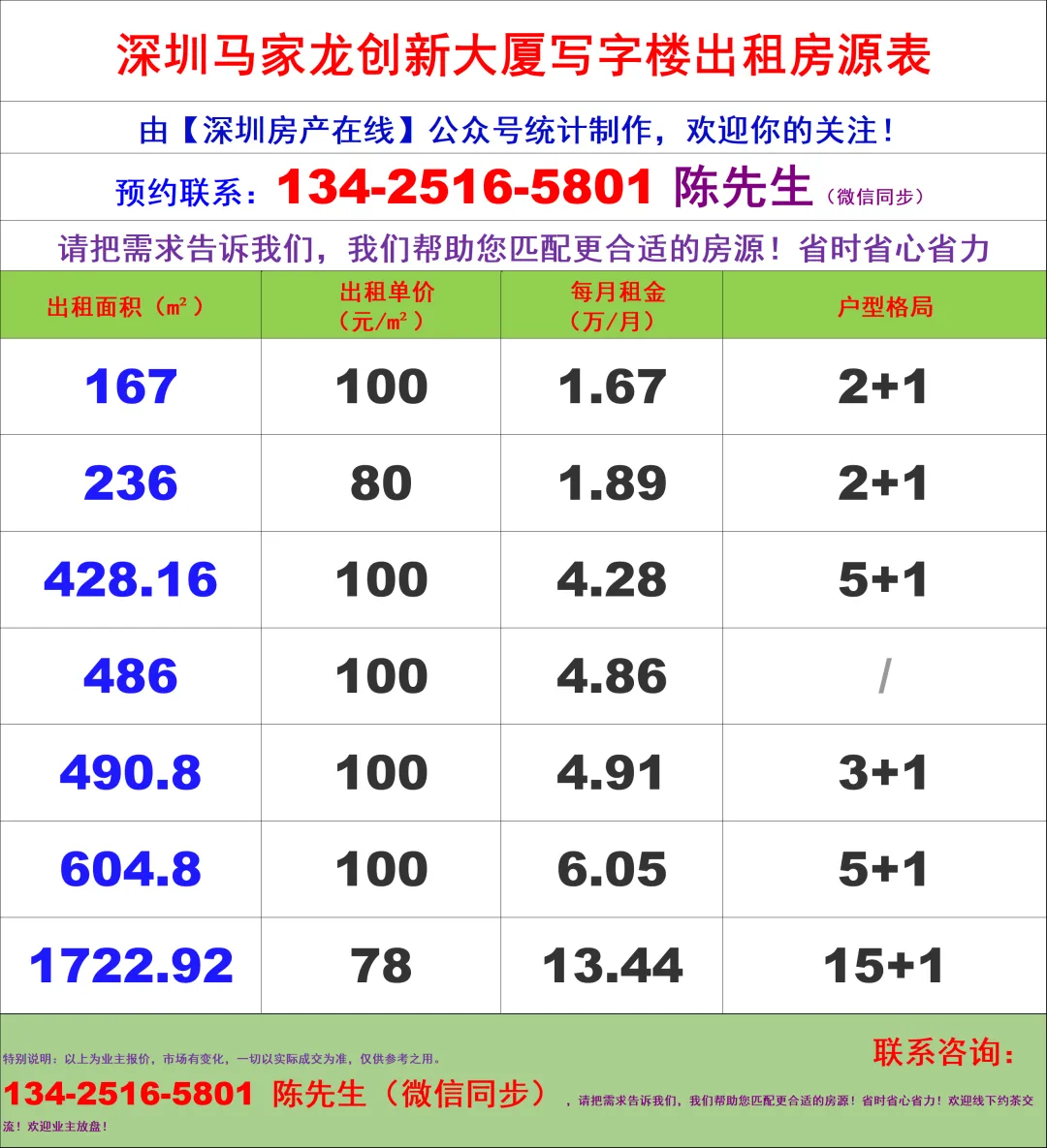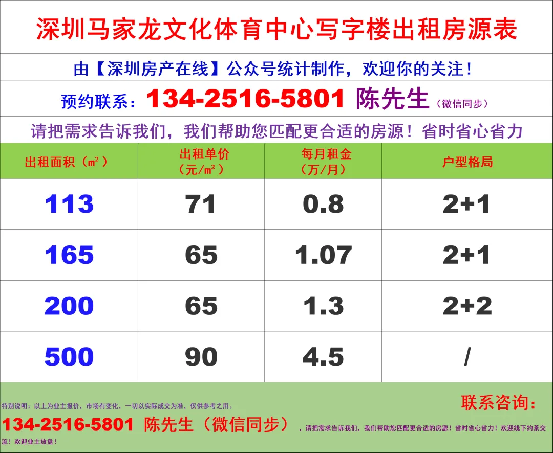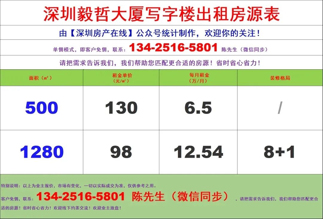 【深圳房产在线】陈经理写字楼租售团队:134-2516-5801 (微信同步)