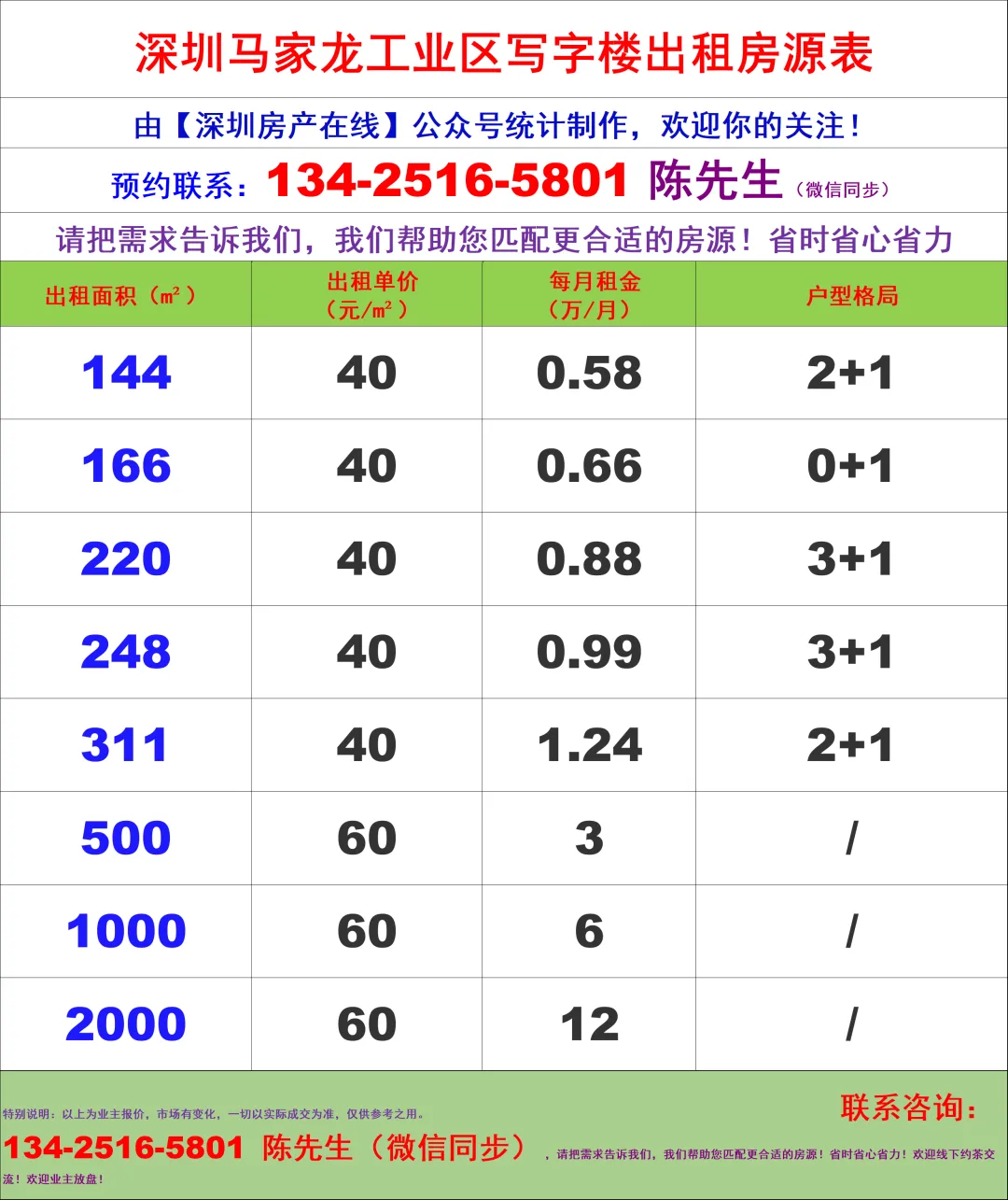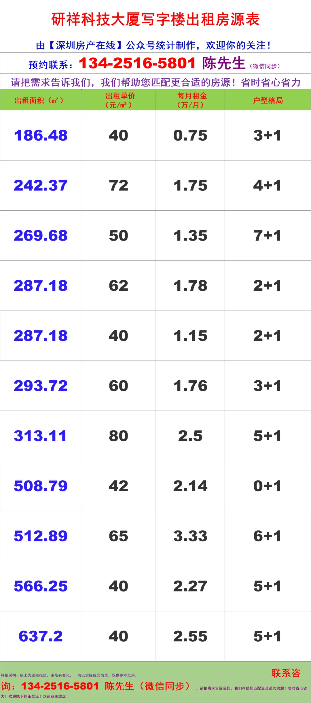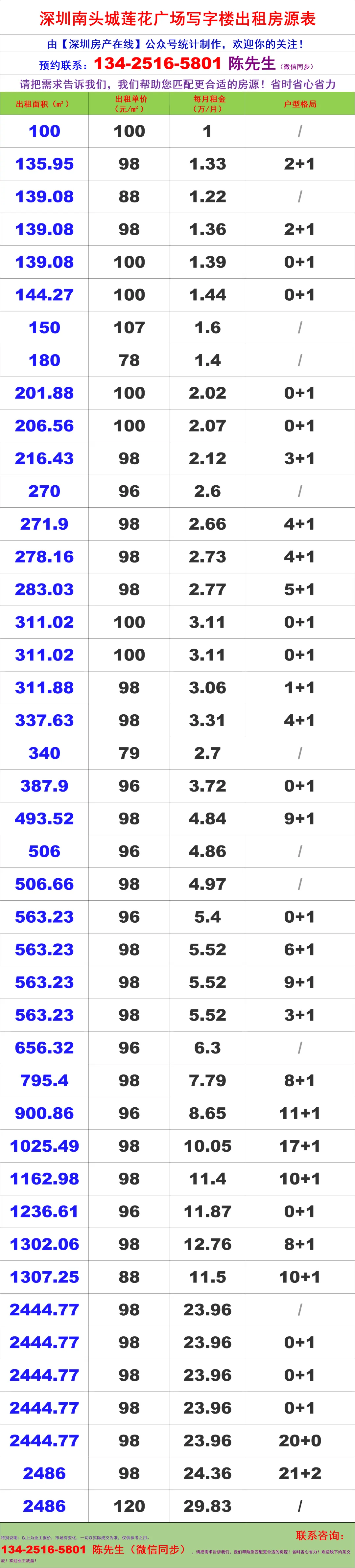 【深圳房产在线】陈经理写字楼租售团队:134-2516-5801 (微信同步)