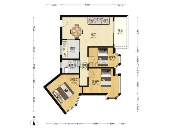◆户型:3室2厅1厨1卫1阳