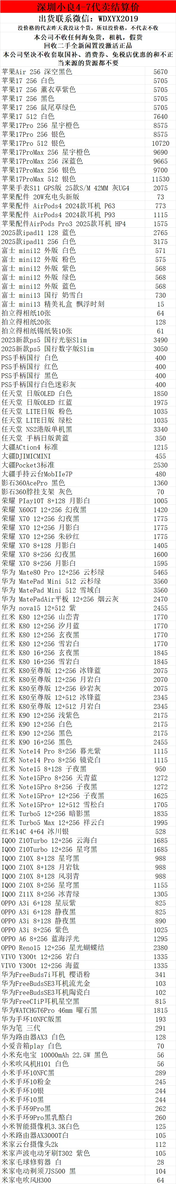 深圳小良2026.4.7电子产品代卖结算价(美妆价格小程序查看)