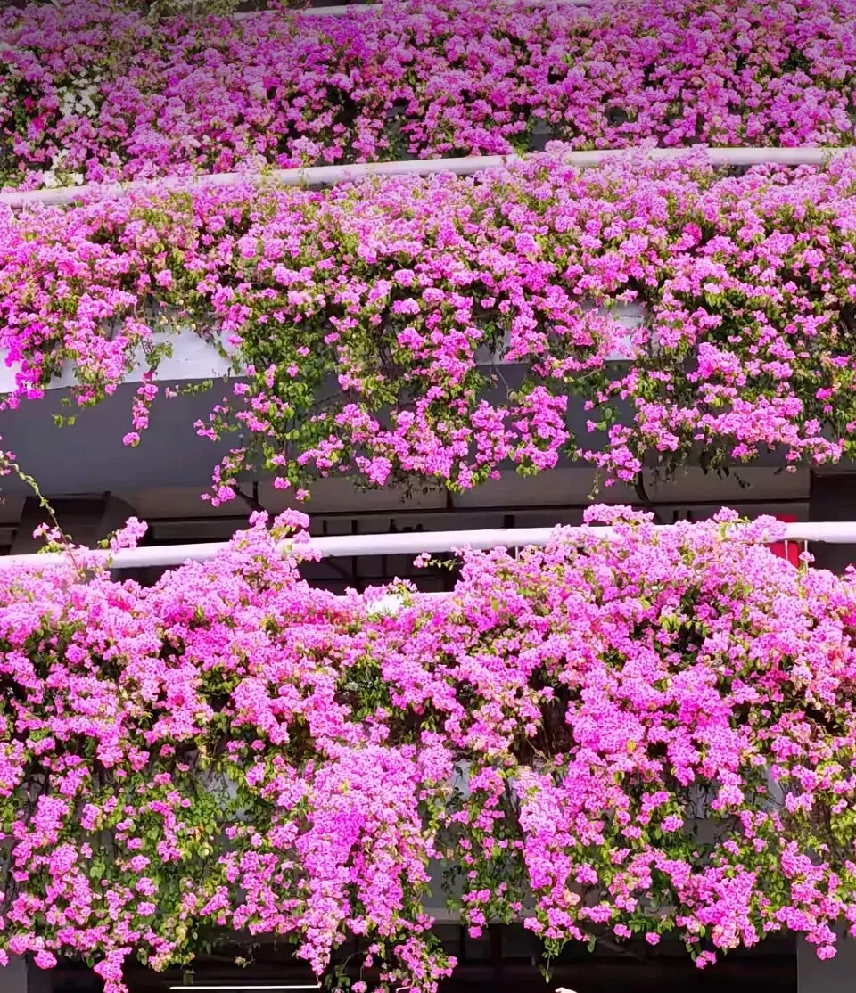 近万平方米的植物幕墙,让建筑外立面的绿化率高达92%。作为深圳市花的簕杜鹃(三角梅)沿着每一层的栏杆攀援生长,花开时节,粉紫、玫红的花簇从高处倾泻而下,形成震撼人心的花海瀑布,远远望去,整座建筑宛如一艘航行在花浪里的巨轮。