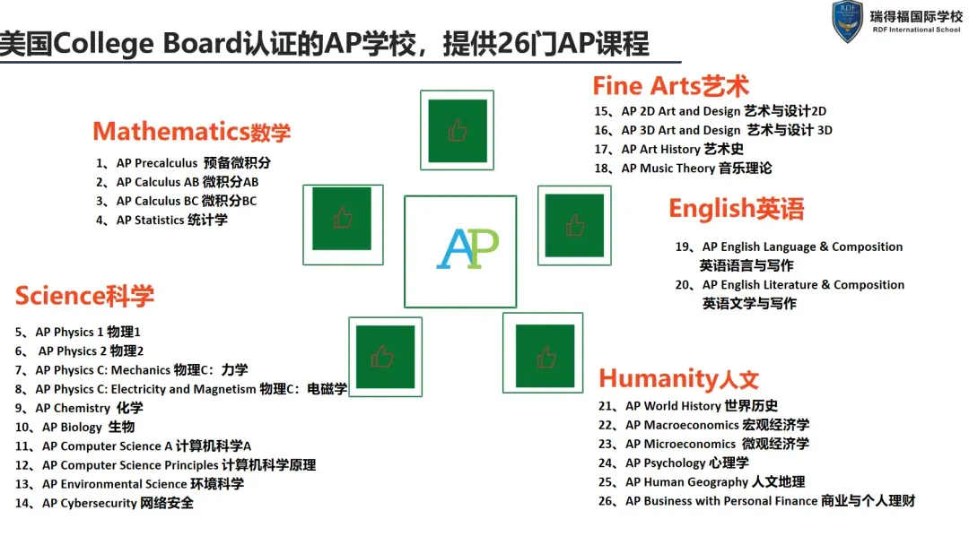 瑞得福国际学校作为美国大学理事会授权的AP学校,课程涵盖ESL、TOEFL、ACT、26门AP课程以及三门二外:西班牙语、法语、德语,满足不同学生的学习需求。