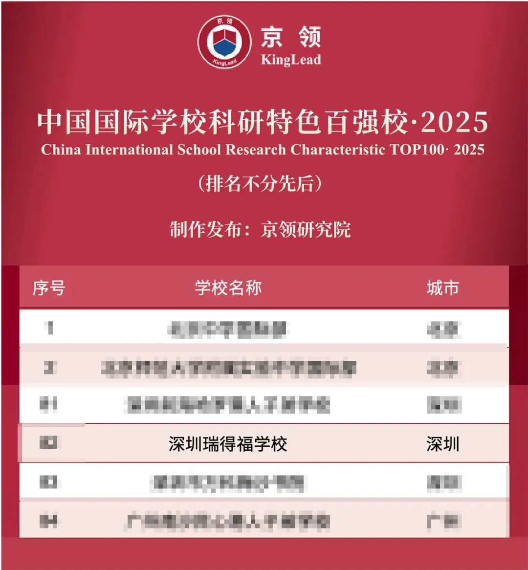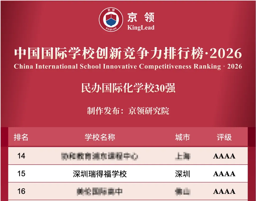 在京领2026年中国国际学校创新竞争力排行榜中,瑞得福国际学校再次凭借卓越实力跻身榜单,位列深圳民办国际化学校第2名、全国前15强,并荣获 “4A”级创新名校!