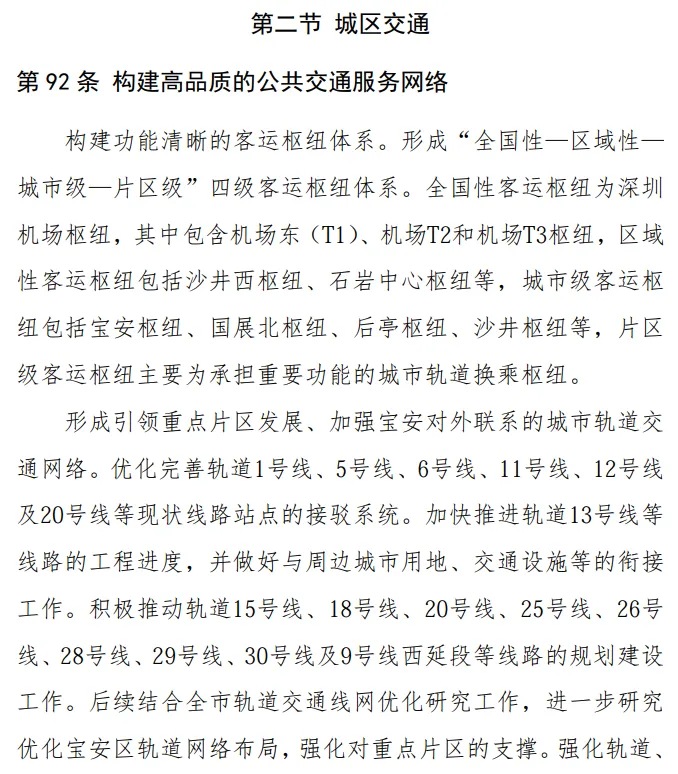 《深圳市宝安区国土空间分区规划(2021—2035年)》里提到:积极推动轨道15号线、18号线、20号线、25号线、26号线、28号线、29号线、30号线及9号线西延段等线路的规划建设工作。后续结合全市轨道交通线网优化研究工作,进一步研究优化宝安区轨道网络布局,强化对重点片区的支撑。