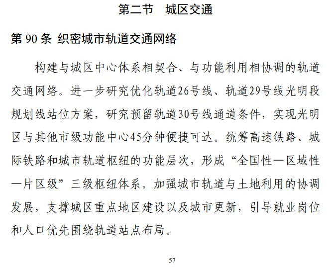 《深圳市光明区国土空间分区规划(2021—2035年)》里提到:构建与城区中心体系相契合、与功能利用相协调的轨道交通网络。进一步研究优化轨道26号线、轨道29号线光明段规划线站位方案,研究预留轨道30号线通道条件,实现光明区与其他市级功能中心45分钟便捷可达。