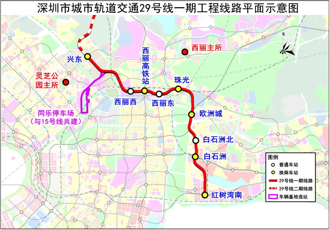 29号线位于南山至光明发展轴,起于红树湾南站,终于兴东站,全长11.16km,共设车站9座,全线均为地下敷设。线路建成后,将串联深超总、白石洲、西丽、石岩、光明科学城等片区和城市功能节点。