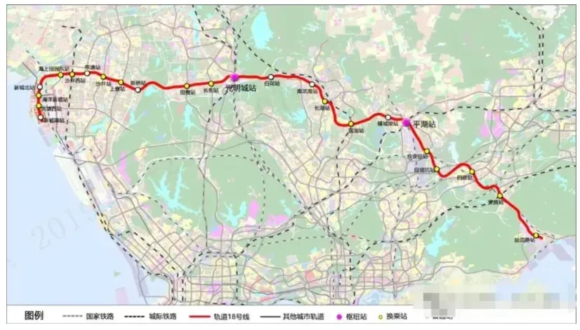 众所周知,深圳地铁18号线西起大空港,经沙井、光明城枢纽、观澜、平湖枢纽、横岗,东至盐田路,全长约63公里。此前规划的18号线一期为服务宝安北部中心、光明的轨道快线,在2022年上报国家审批中落选。后来很多信息表明各方都在努力争取让其进入地铁建设五修编制。