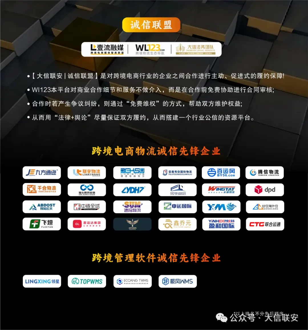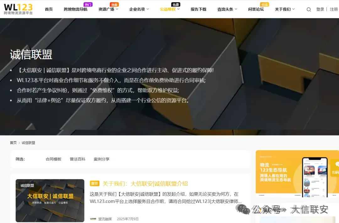 WL123 联合大信法务推出【大信联安 | 诚信联盟】项目——通过法律机制解决货代行业信任问题。参与联盟的物流企业共同出资建诚信基金池,无论物流方还是卖家方,只要通过 WL123 平台合作出了纠纷,基金支持走法律途径维权,合同审核也免费。目前已有 28 家企业加入。